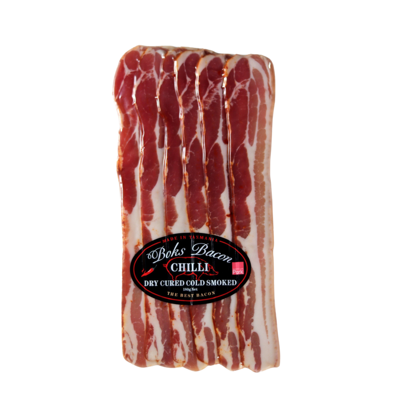 Experience the perfect blend of heat and flavour with Boks Chilli Bacon—traditionally dry cured and infused with spicy chillies.